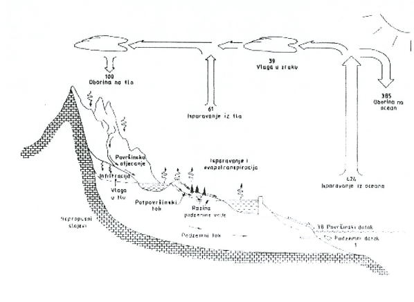 Na slici je prikazano kruženje vode u prirodi. Hidrološki ciklus je važan za razumijevanje vodne bilance, odnosno vodnoga bilanca. Vodna bilanca je pregled raspoložive vode temeljen na načelu da tijekom određena vremenskog intervala ukupni višak ili manjak vode u danom slivnom području mora biti jednak zbroju ukupnog gubitka ili viška vode i neto promjeni zalihe vode u slivu ili vodnom objektu.